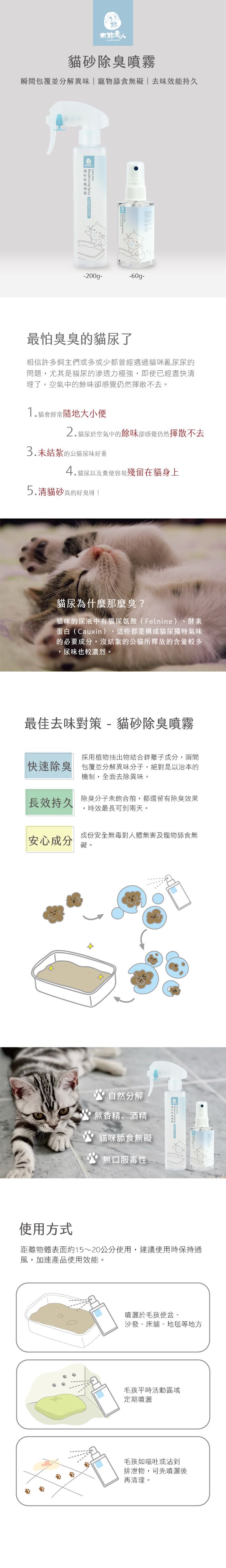 產品為無味無添加,皆為植物萃取物,瞬間包覆併分解異味!針對貓咪使用研發,幾乎無任何味道,成份安心,適合對氣味敏感的貓咪,寵物舔食無害 ,除臭效果持久!幫助貓砂除臭、抗菌、讓家裡空氣恢復清新 !